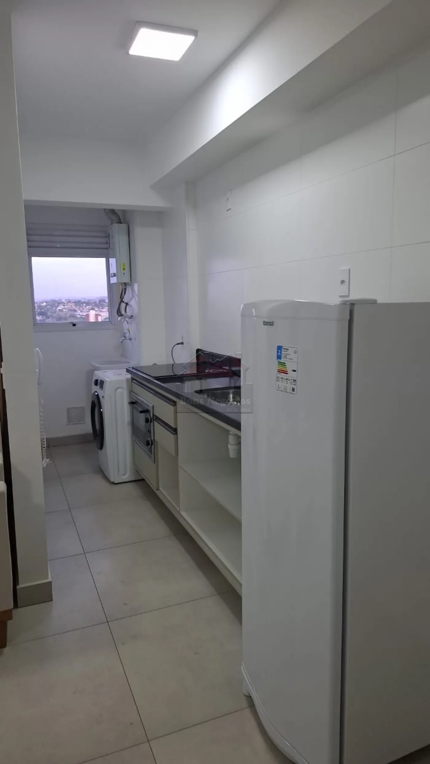 Ambientes de quarto, sala, cozinha completa, área de serviço e sacada.