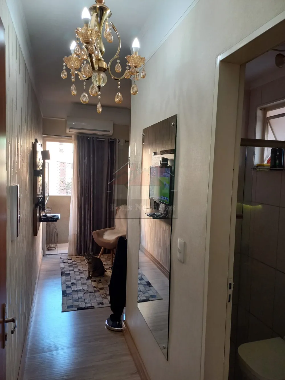 Este apartamento é perfeito para quem busca praticidade e conforto. O quarto espaçoso é complementado por um guarda-roupa funcional, enquanto a sala de estar oferece espaço para relaxar e entreter. O painel de TV e o papel de parede adicionam um toque de estilo ao ambiente.